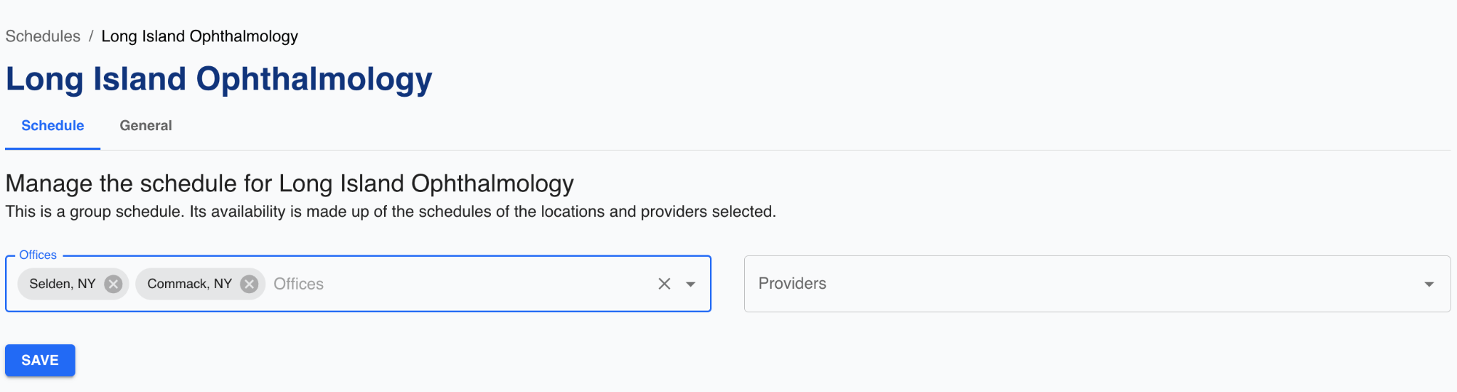 The Schedules tab is divided into three sections 1) Offices 2) Providers 3) Groups.