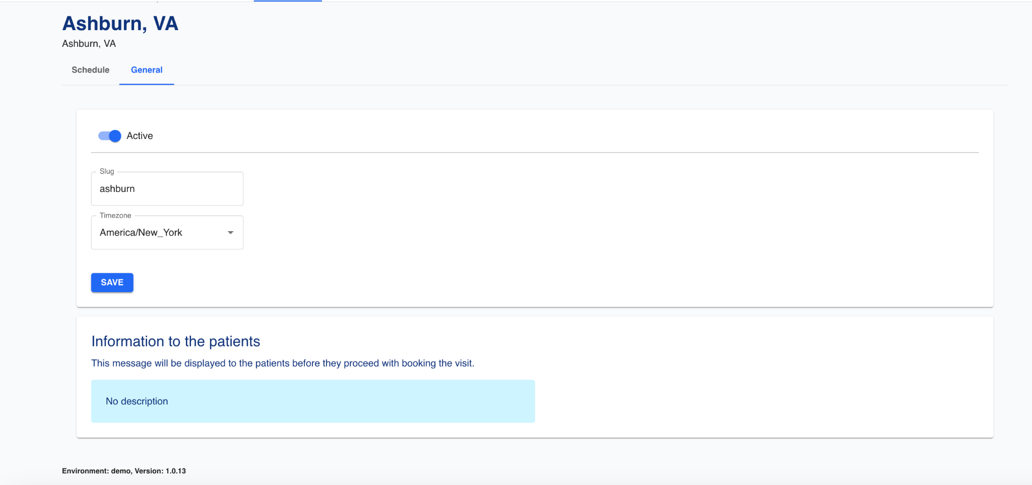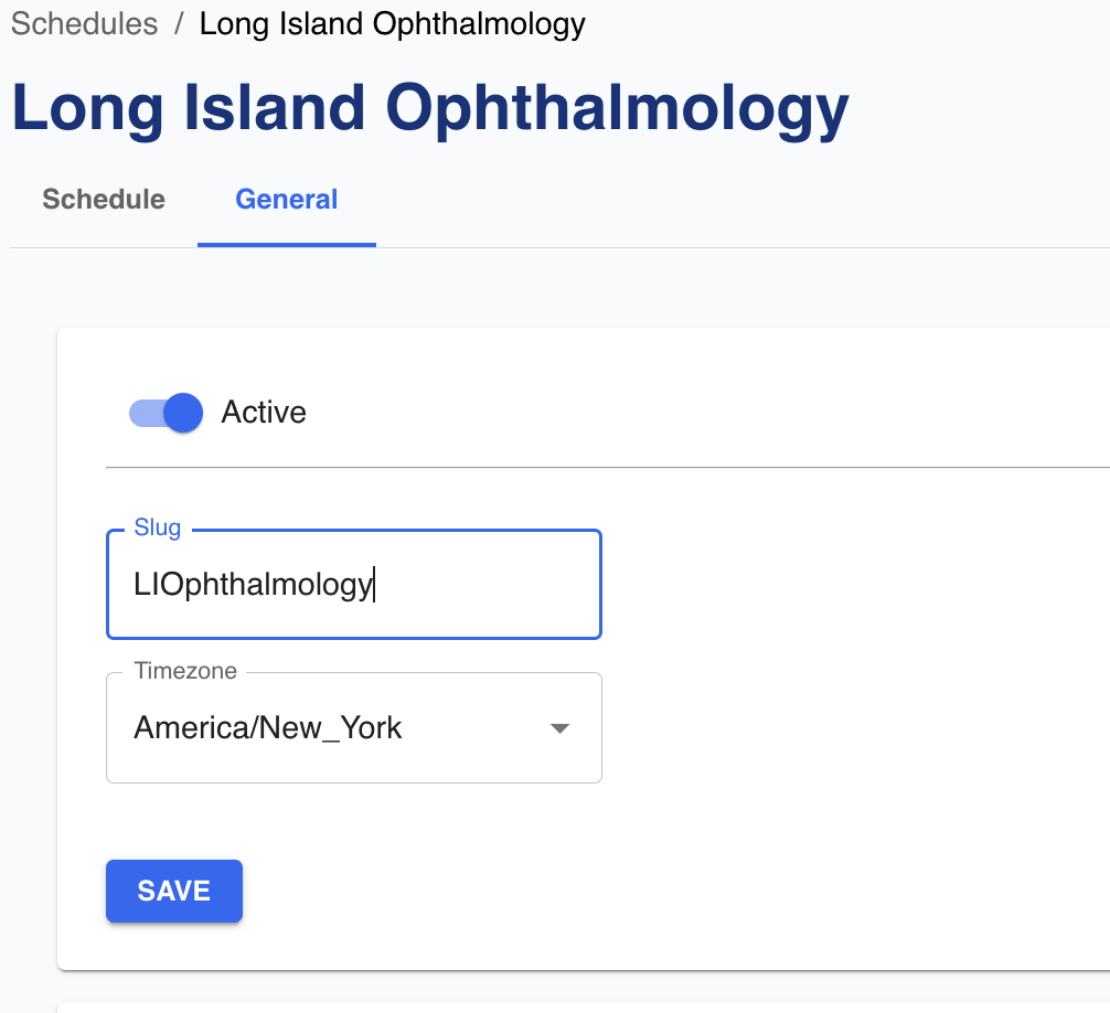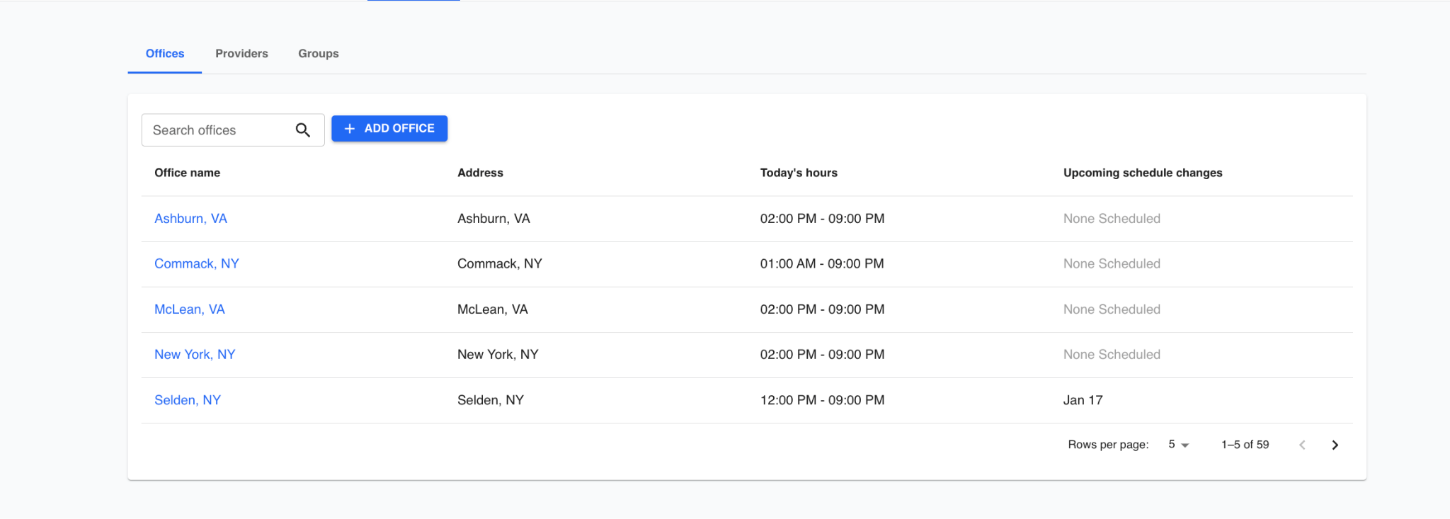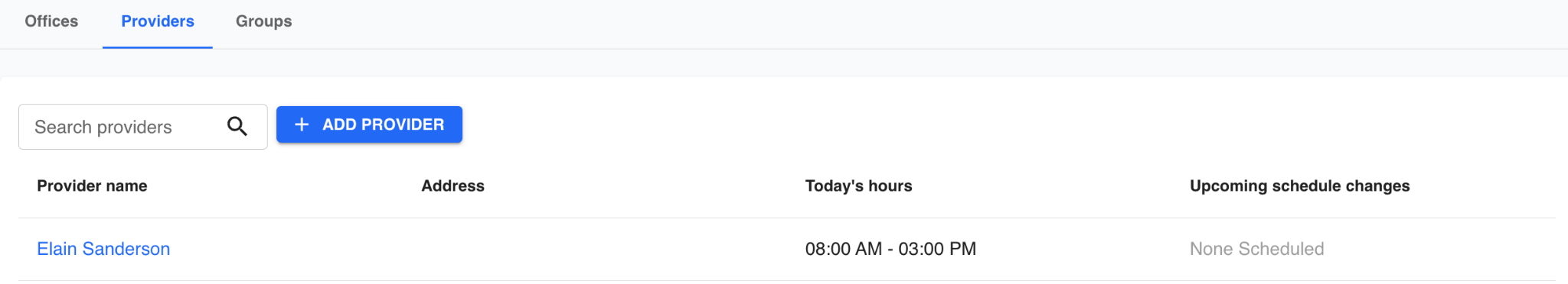 The Schedules tab is used to configure schedules for Office/Locations, In-Person Providers, and Groups. (Telemed/Virtual Providers are configured in the Employees tab. This will be consolidated in the future.)