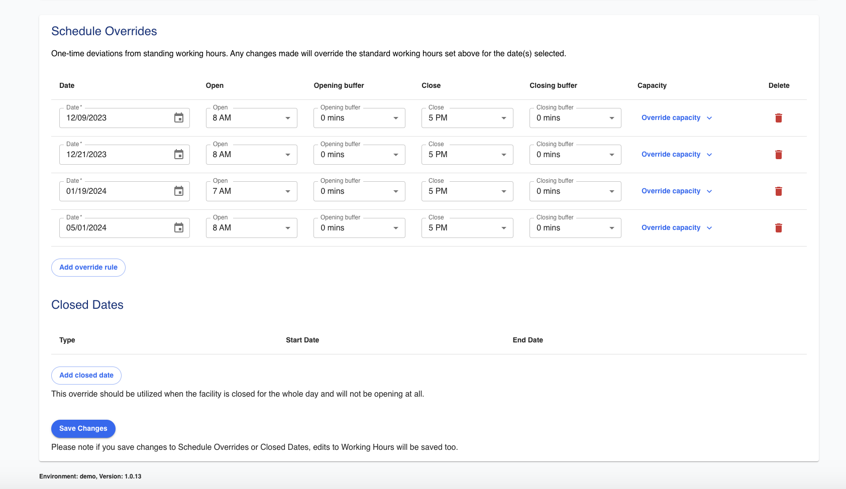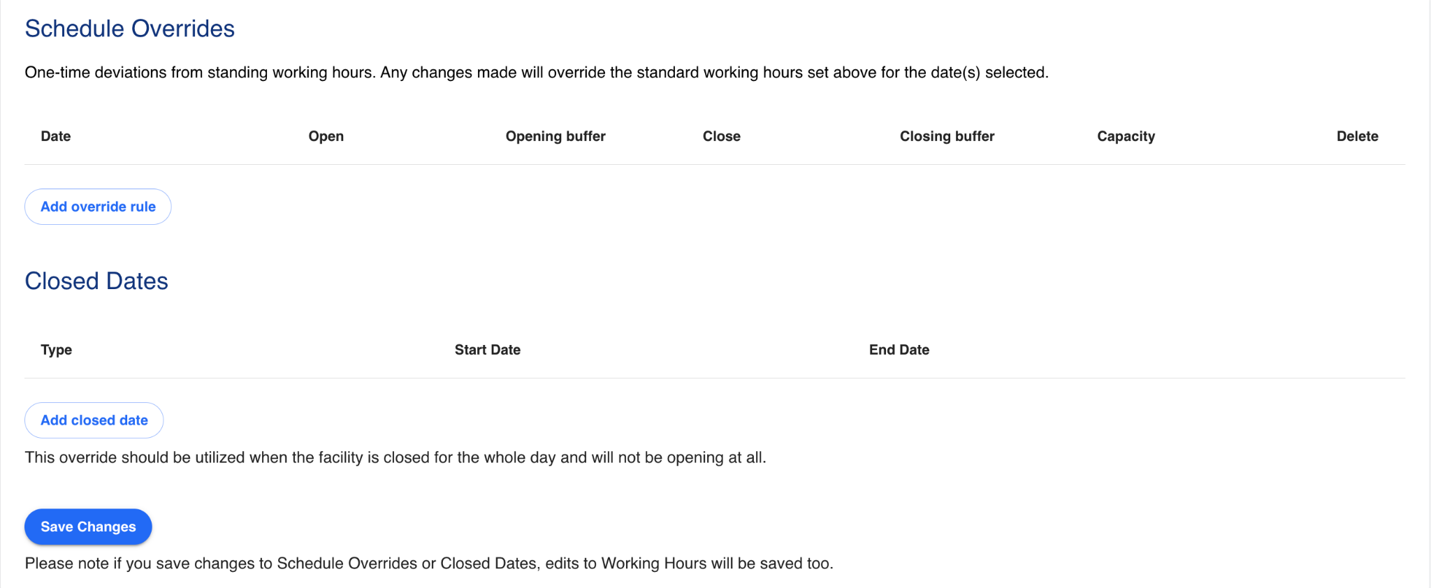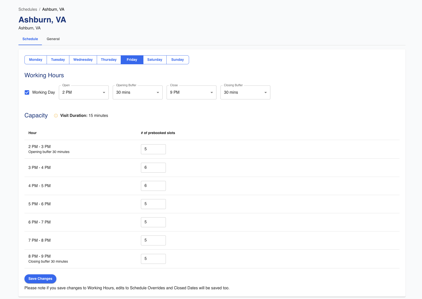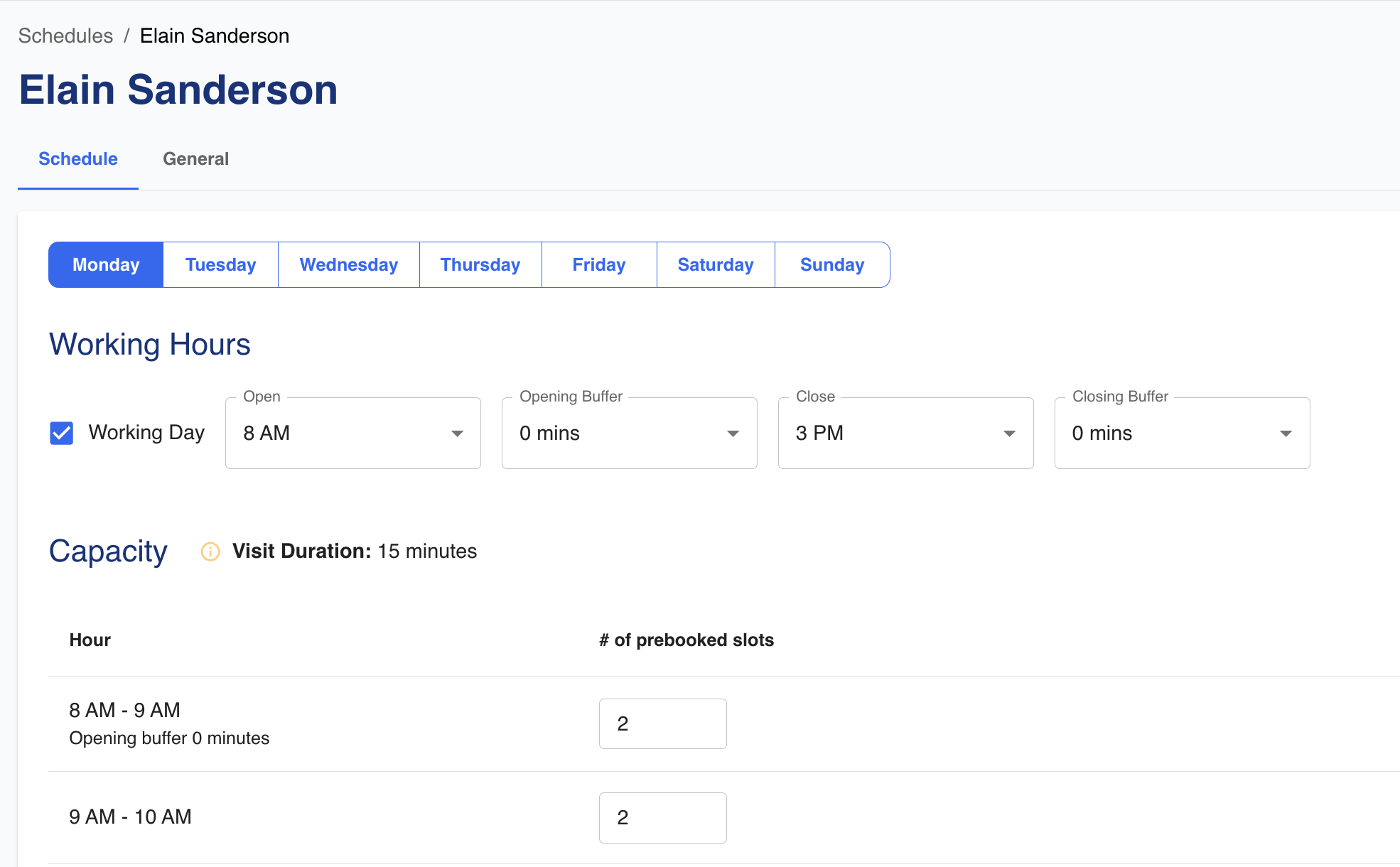 Users are able to search by name or add a new office, provider or group within this section. Clicking on the office/provider/group name will direct the user to the scheduling screen where they can set the working hours (including opening and closing buffers), number of pre-booked slots per hour and add any schedule overrides (one time deviations from standard working hours) and closed dates (whole day closures). Toggling to a different day of the week will set the hours for that day of the week moving forward until the settings are updated or a schedule override or closed date is set. Group schedules are made up from the availability of the schedules of the locations and providers selected.