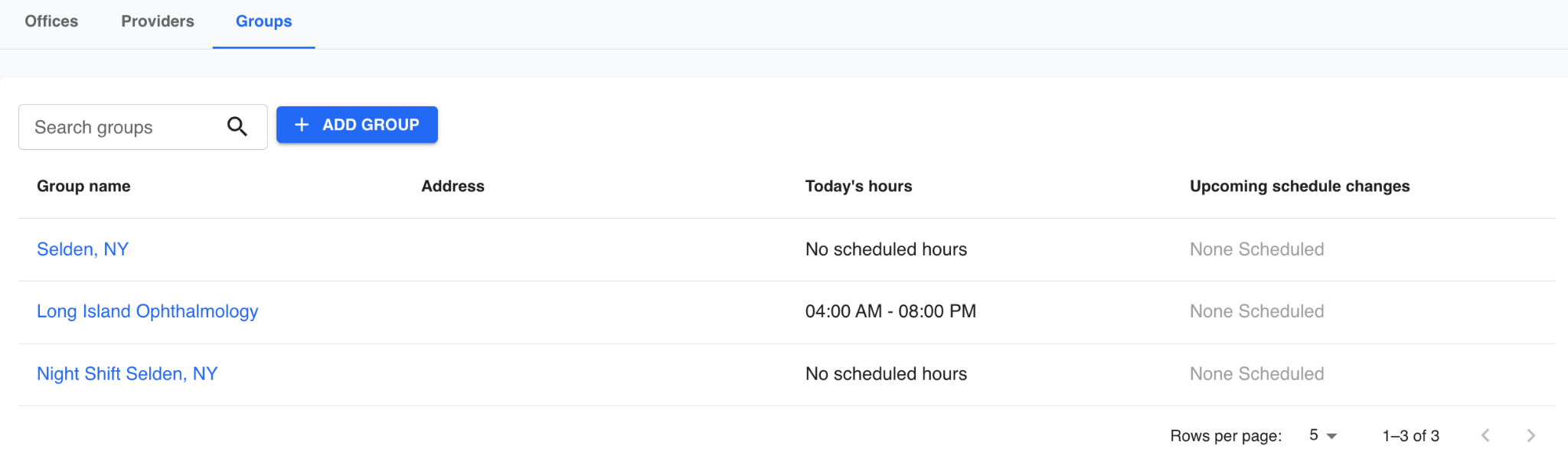 Groups are collections of Providers and Offices/Locations. The group schedule will be a composite schedule for the Providers and Offices configured for that group.