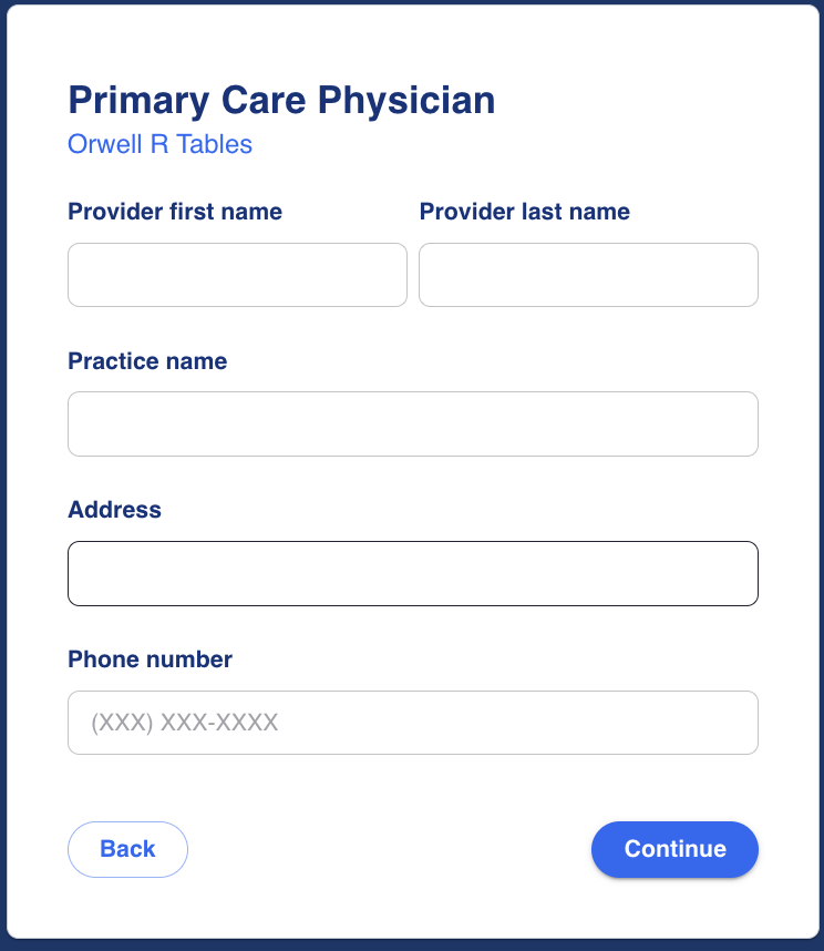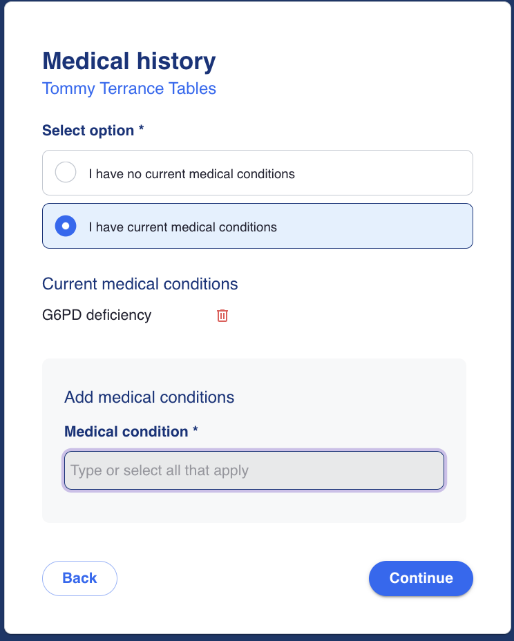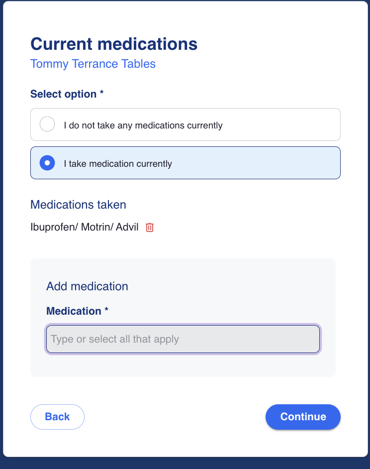 If the drop-down does not include the option they need, they are able to manually enter using free-text. These inputs will be carried through to the provider view for verification of medical history by the provider.