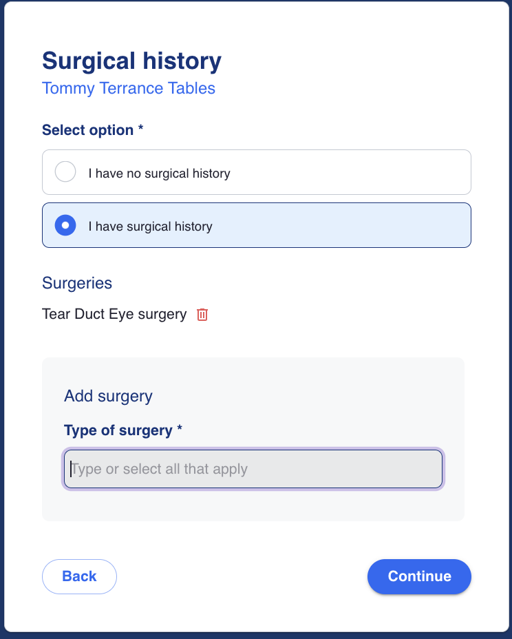 If the drop-down does not include the option they need, they are able to manually enter using free-text. These inputs will be carried through to the provider view for verification of Surgical history by the provider.