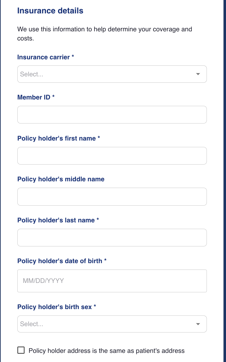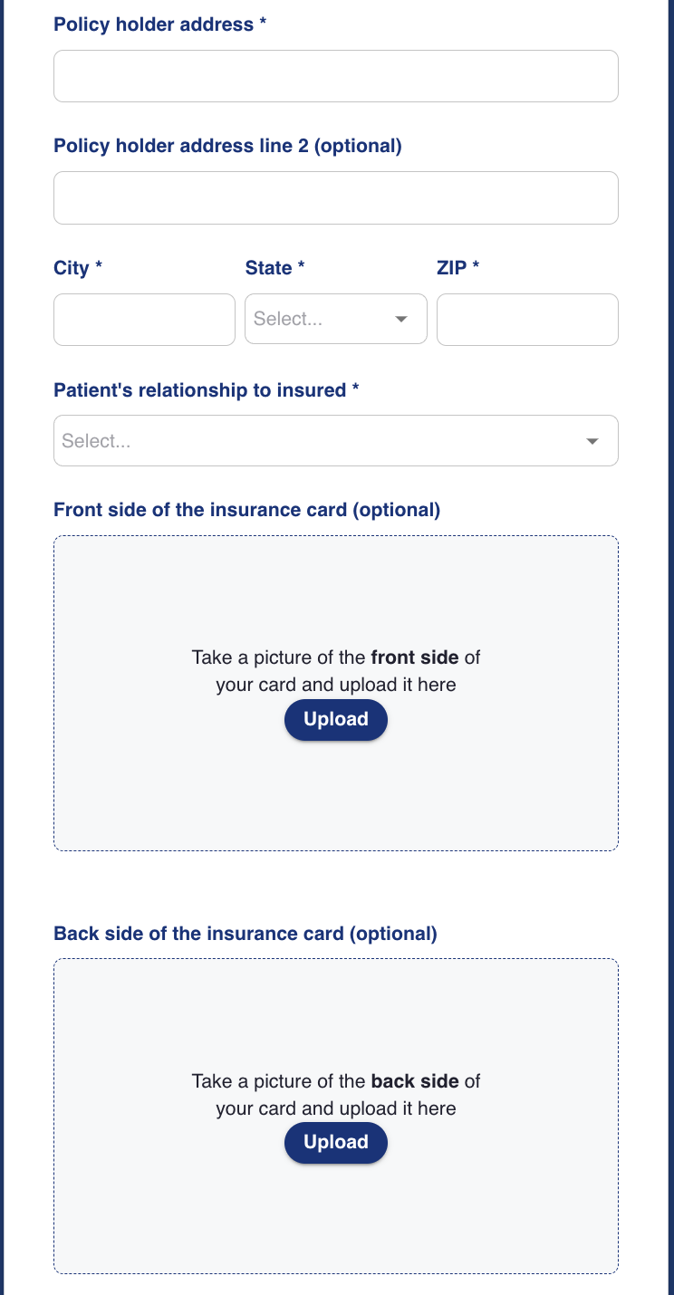 The user will then be prompted for payment details. The payment can be claimed against insurance, or collected directly from the patient. If "I have insurance" is selected, the application will request detailed insurance information. Multiple insurances can be submitted. An eligibility check can be made here.