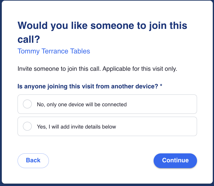 The user is able to invite an additional participant to the virtual visit by inputting their name, phone number (required) and email, if email is the preferred method of communication. A link to join the call will be sent to the participant using their preferred method of communication. Once the participant clicks the link, they will be sent to the waiting room and will join once the provider starts the call. The link is only applicable for that visit only.
