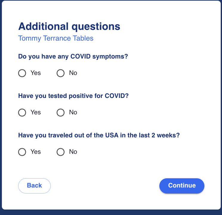 In addition, patients will be asked several yes/no questions about whether or not they have any COVID symptoms, have tested positive for COVID or have traveled out of the USA in the last 2 weeks. These questions are populated from a data store which can be customized without redeployment.
