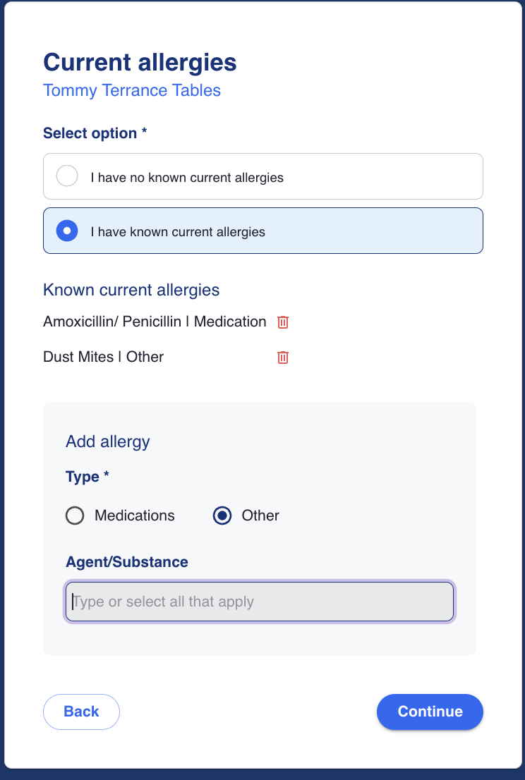 The patient can select allergies from medication or other allergies. If the drop-down does not include the option they need, they are able to manually enter using free-text. These inputs will be carried through to the provider view for verification of allergy by the provider.