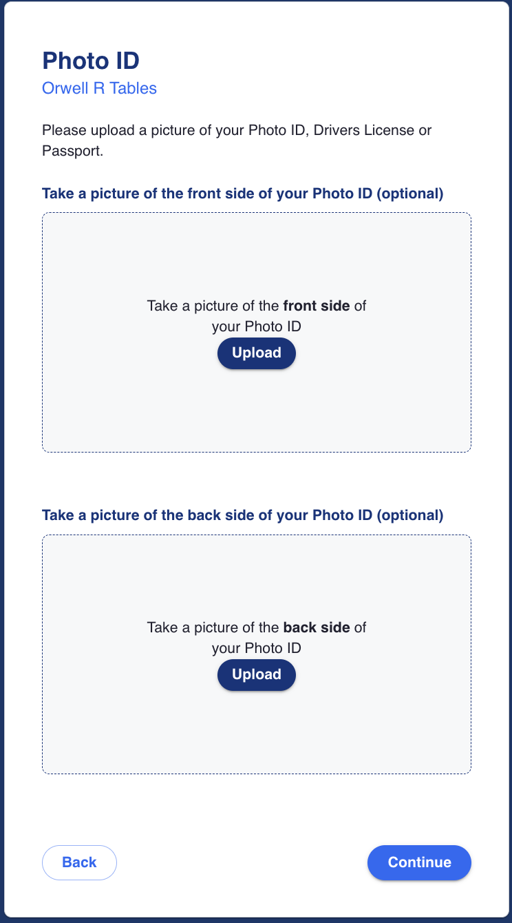 The user is prompted to submit photographs of their valid legal photo identification, front and back.