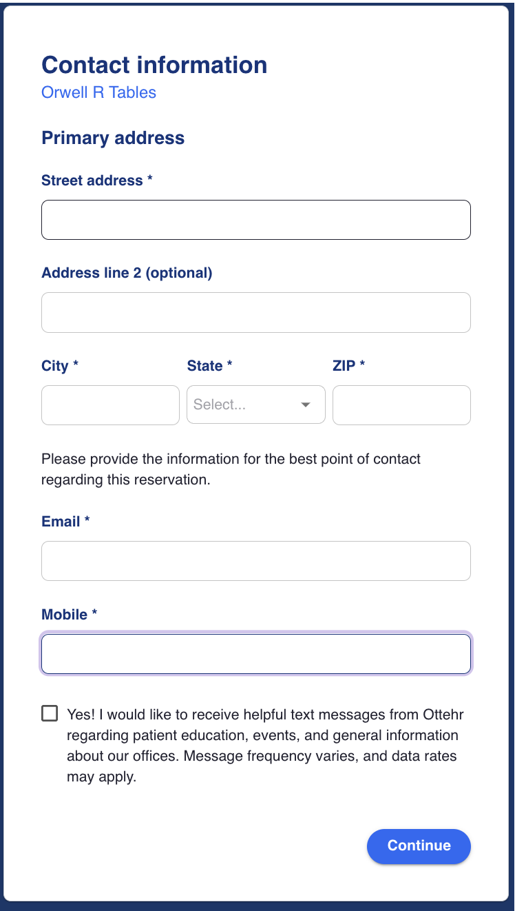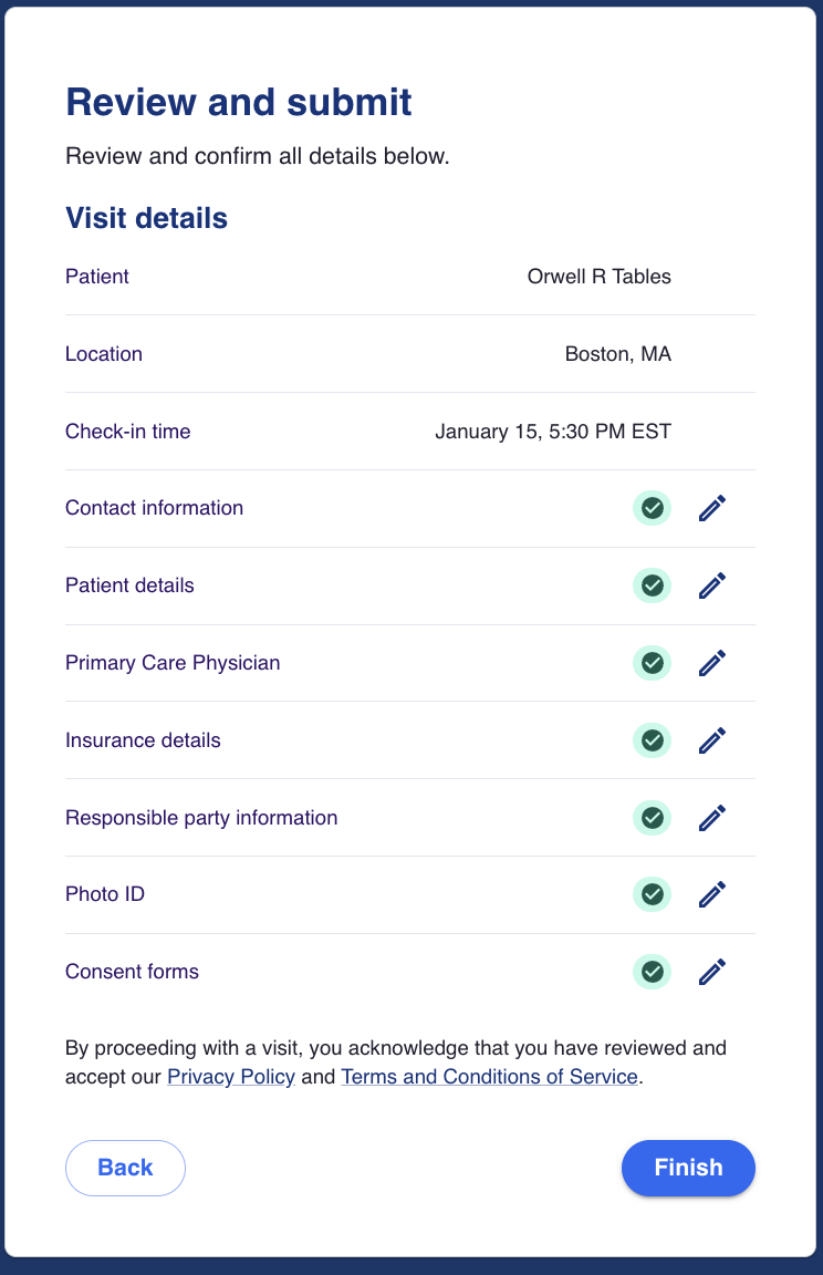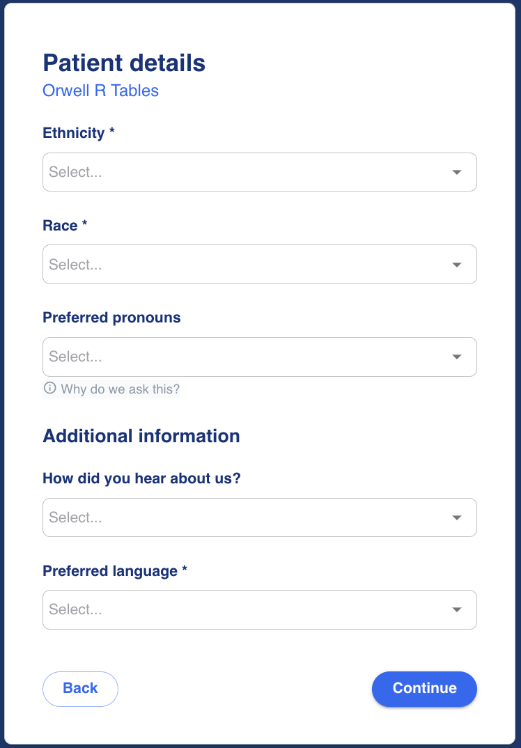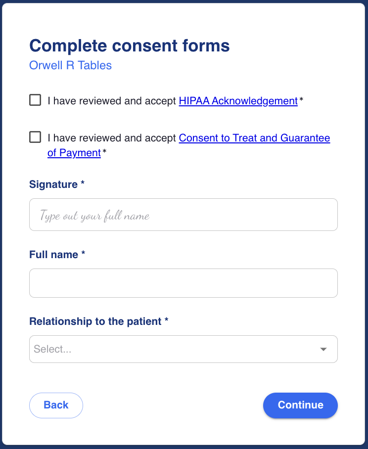 Patients will complete a series of screens to complete their registration paperwork. These screens include details such as patient demographics (address, email, mobile number), patient details (ethnicity, race, pronouns, preferred language), primary care physician details (name, address, practice name, phone number), medical history, payment information, photo ID and consent forms where the patient will complete a virtual signature.