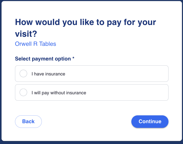 If the user selects "I will pay without insurance", they can be prompted for credit card information and the credit card will be verified.