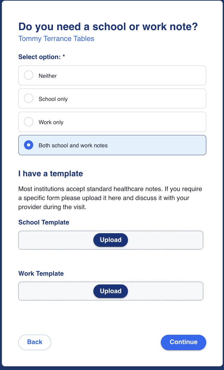 The user is prompted to select whether or not they need a school note, work note, both school and work notes, or neither. Users can optionally attach a sample template to be utilized by the provider when completing their note. School and work notes are provider signed/generated excuses for either missing school or work for medical reasons.
