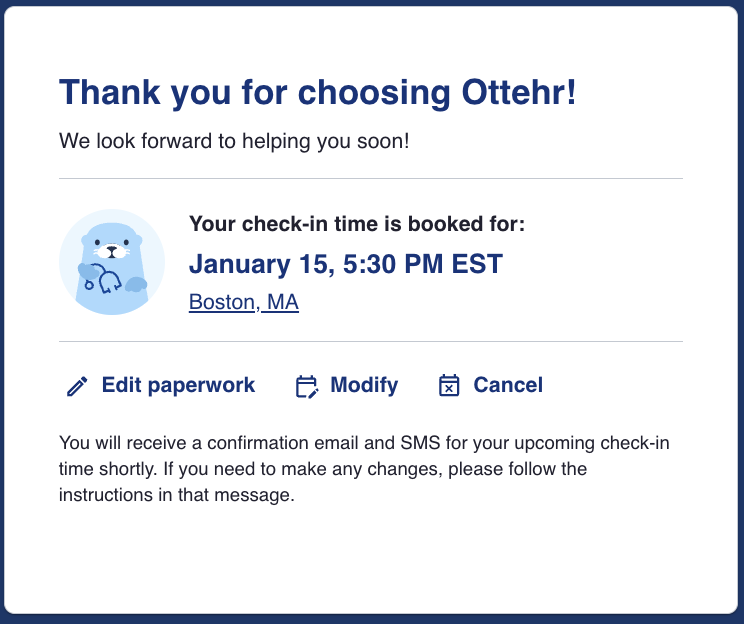 Assuming the user has completed their paperwork, pressing "Finish" takes the user back to the confirmation screen without the prompt to complete paperwork. If the steps were not completed, the reminder to "Complete your paperwork now!" will remain at the bottom.
