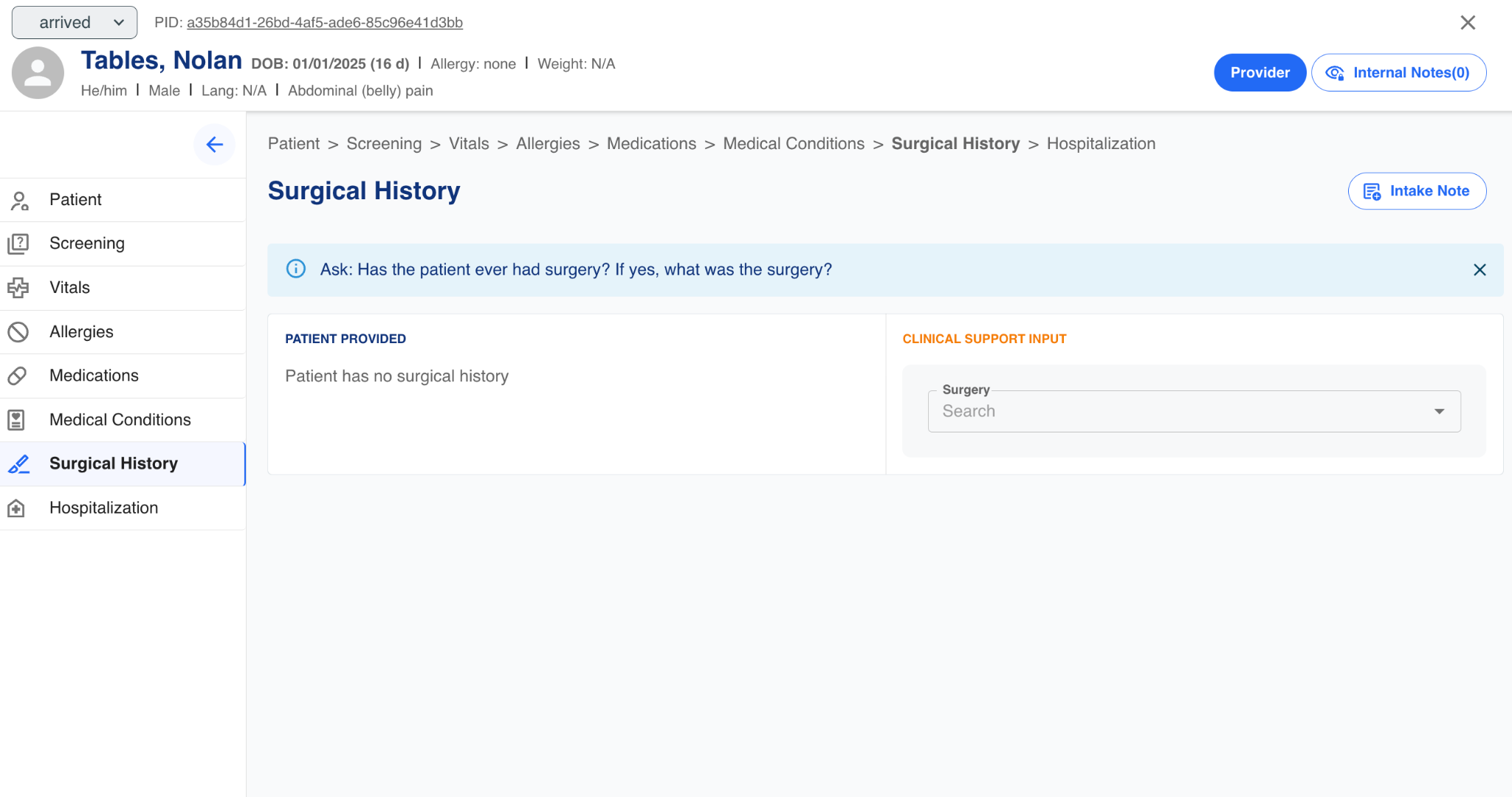 The intake technician can capture information about the patient's prior surgical procedural history. The surgeries in the pulldown list are mapped to ICD-10 codes.