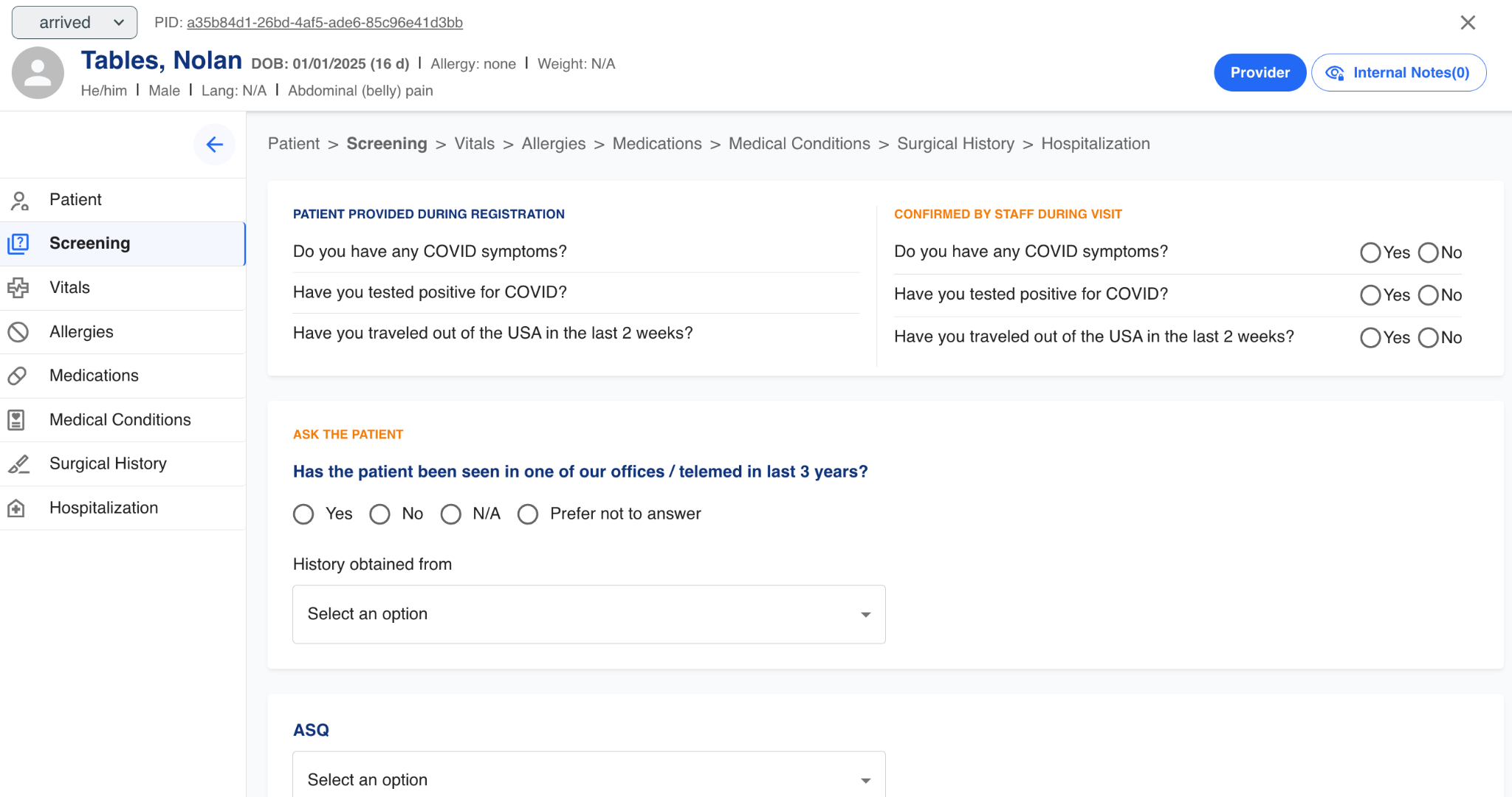 The intake flow is meant for an intake technician to capture preliminary, basic information about the patient before consultation with a provider. Also, this is a chance for the technician to verify information provided by the patient, including name and date of birth to verify identity.