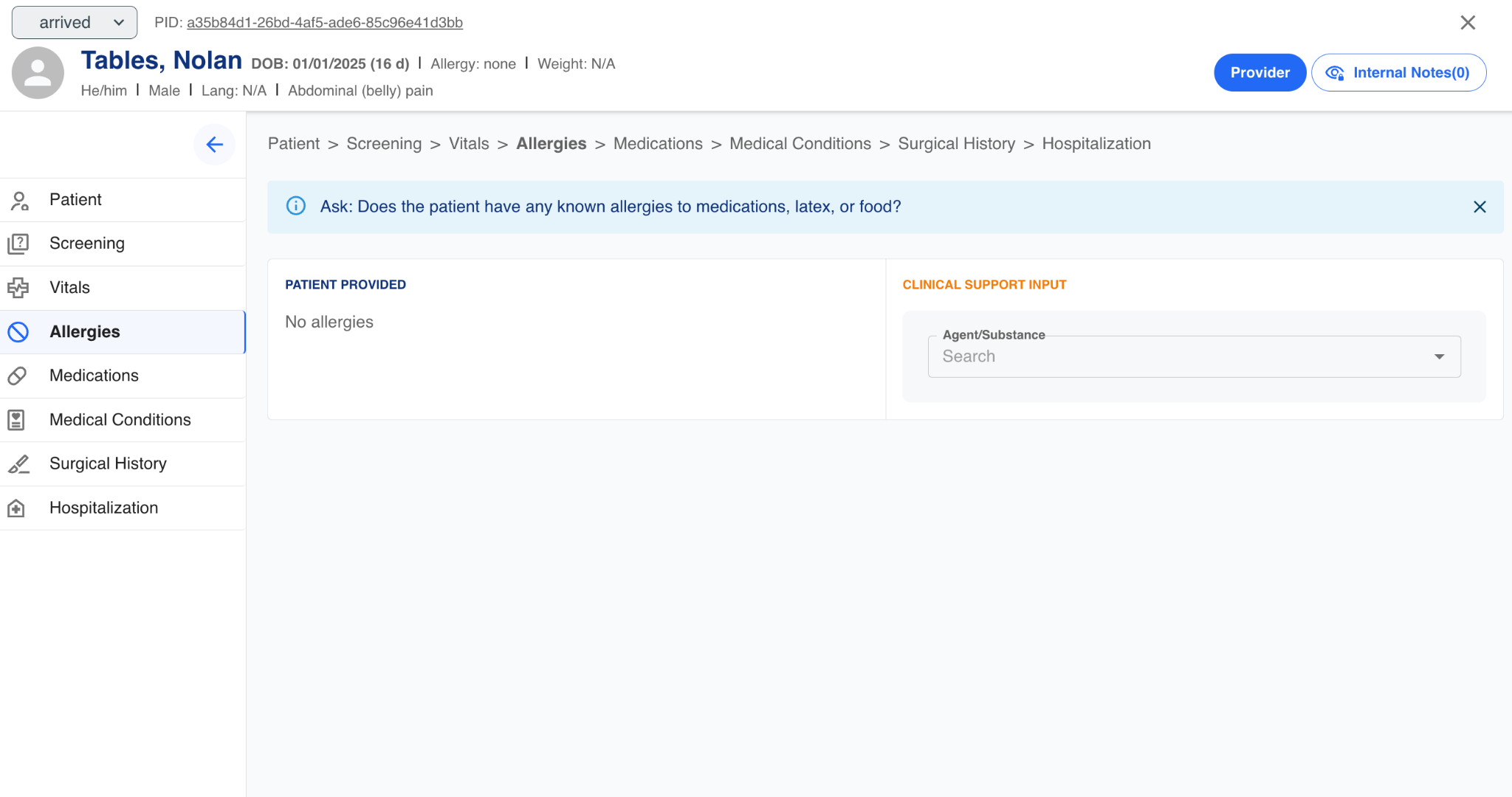 The intake technician can capture information about the patient's current and inactive allergies. The technician starts typing the name of the allergy agent or substance, and the autocomplete function provides a list matching the information being typed. Once an agent/substance is identified and selected from the autocomplete list is added to the intake record.