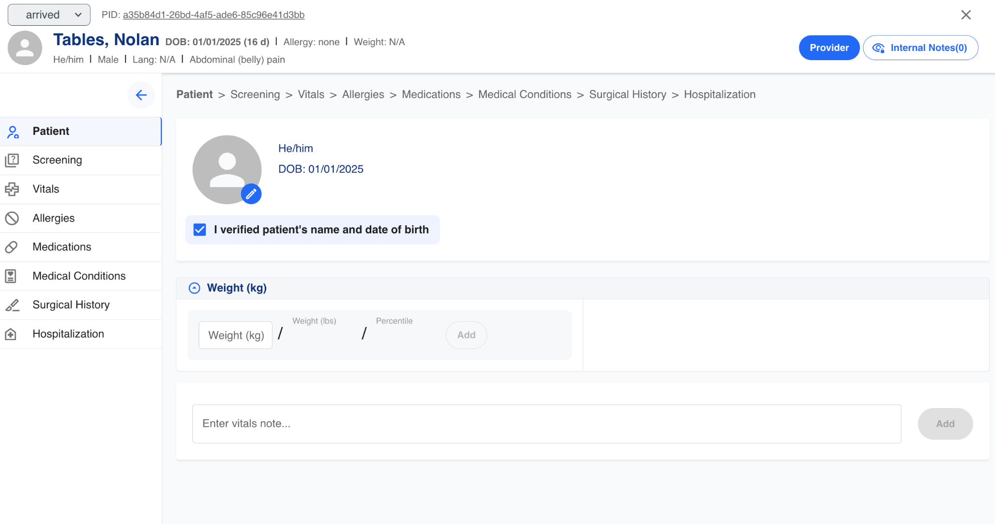 Basic information about the patient can be captured. A picture of the patient can be saved as well as weight and vital notes. Verbal verification of the patient's name and date of birth can be recorded.