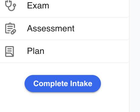 Once Intake has been completed by an intake technician, they can press the "Complete Intake" button in the left rail. This will change the patient status to 'Ready for Provider'.