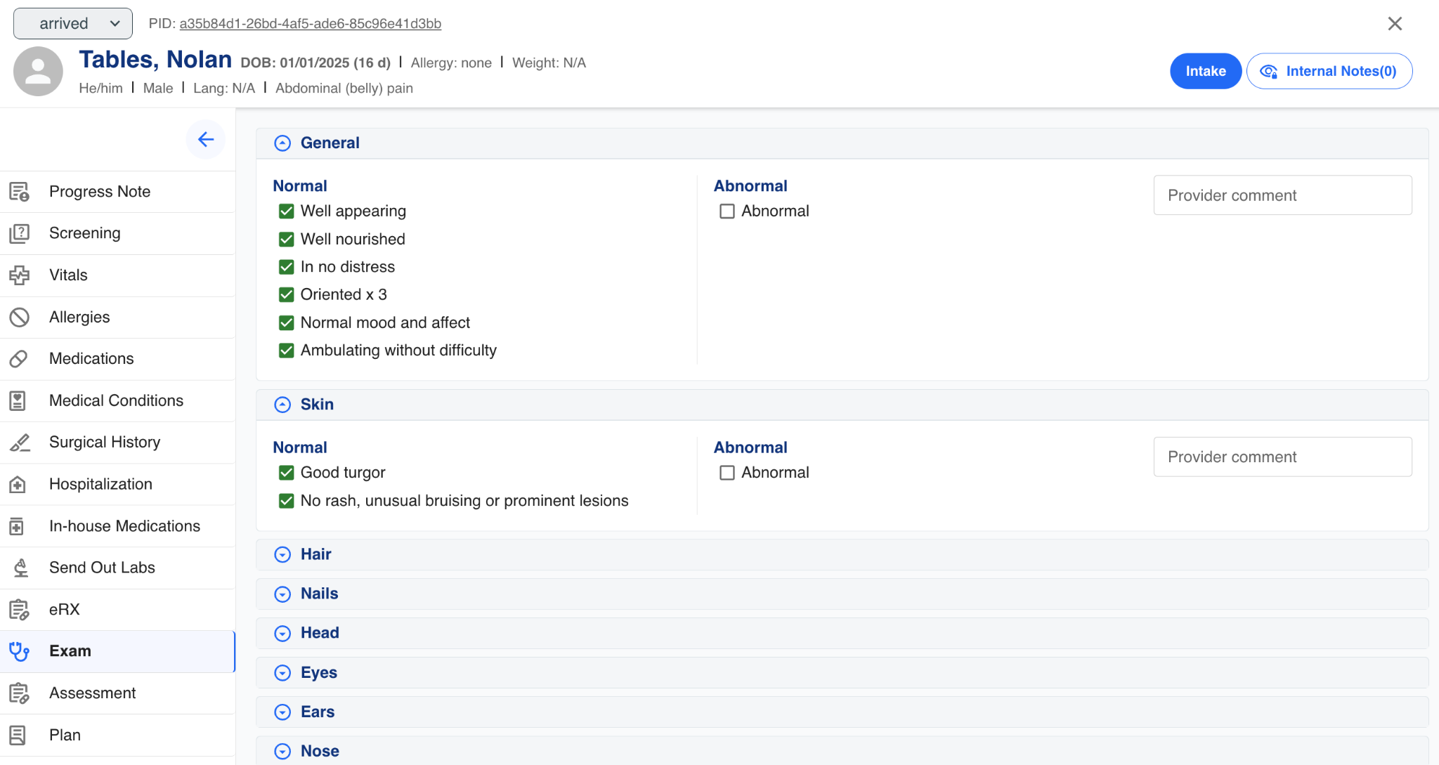 In addition to the screens offered to the intake technician, the provider has several more screens for In-house Medications, eRX, Exam, Assessment, and Plan.