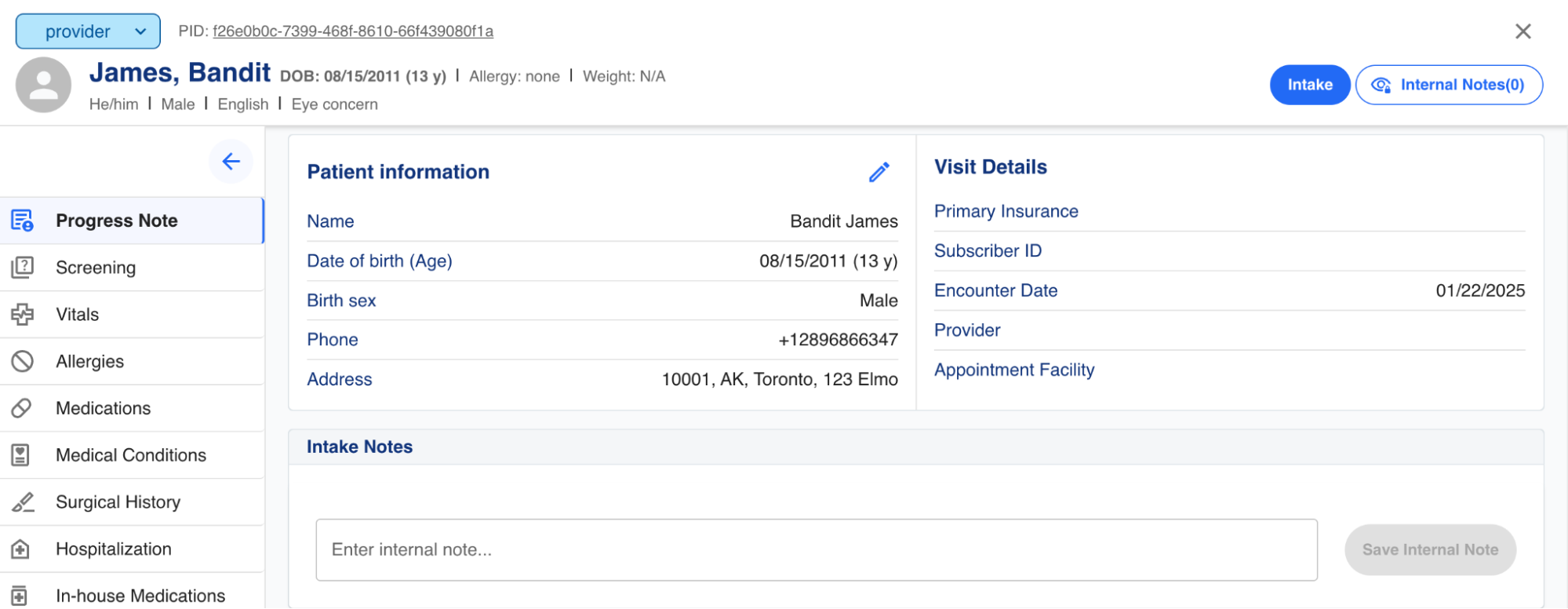 If the provider wants to return to the tracking board screen, they can click on the X in the upper right hand corner. To get back to the Intake workflow, they click on the blue intake button (which then changes that button to "provider" to be able to return to the provider flow), and if there are any internals notes from the intake process, the button will have a number other than 0 in the parentheses.