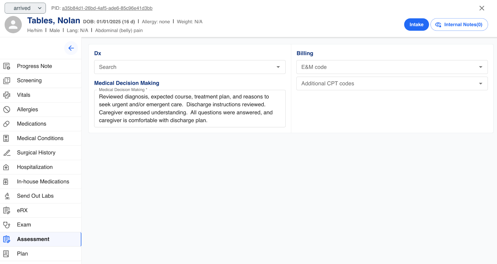 Diagnosis codes (Dx), E&M Codes, and additional CPT codes can be specified by the provider.
