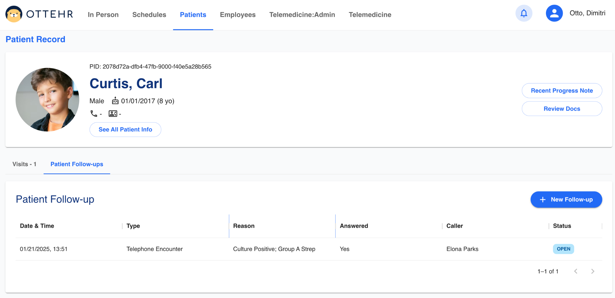 Staff can add a patient follow-up encounter by capturing information about the encounter like 'Reason' and 'Type' and annotate as to whether the follow-up was resolved.