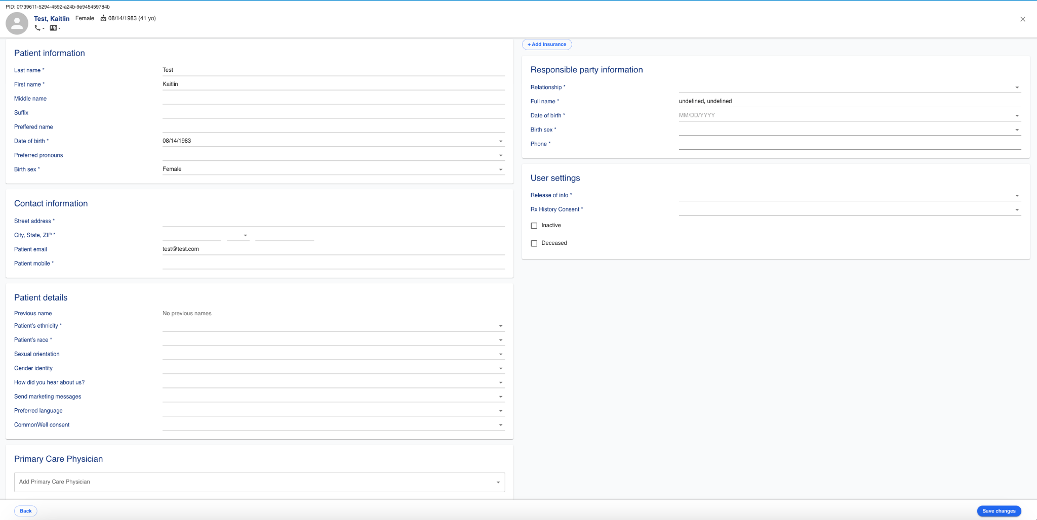 Patient demographic details, such as name, DOB, sex, address, email, mobile number, as well as ethnicity, race, pronouns, preferred language.