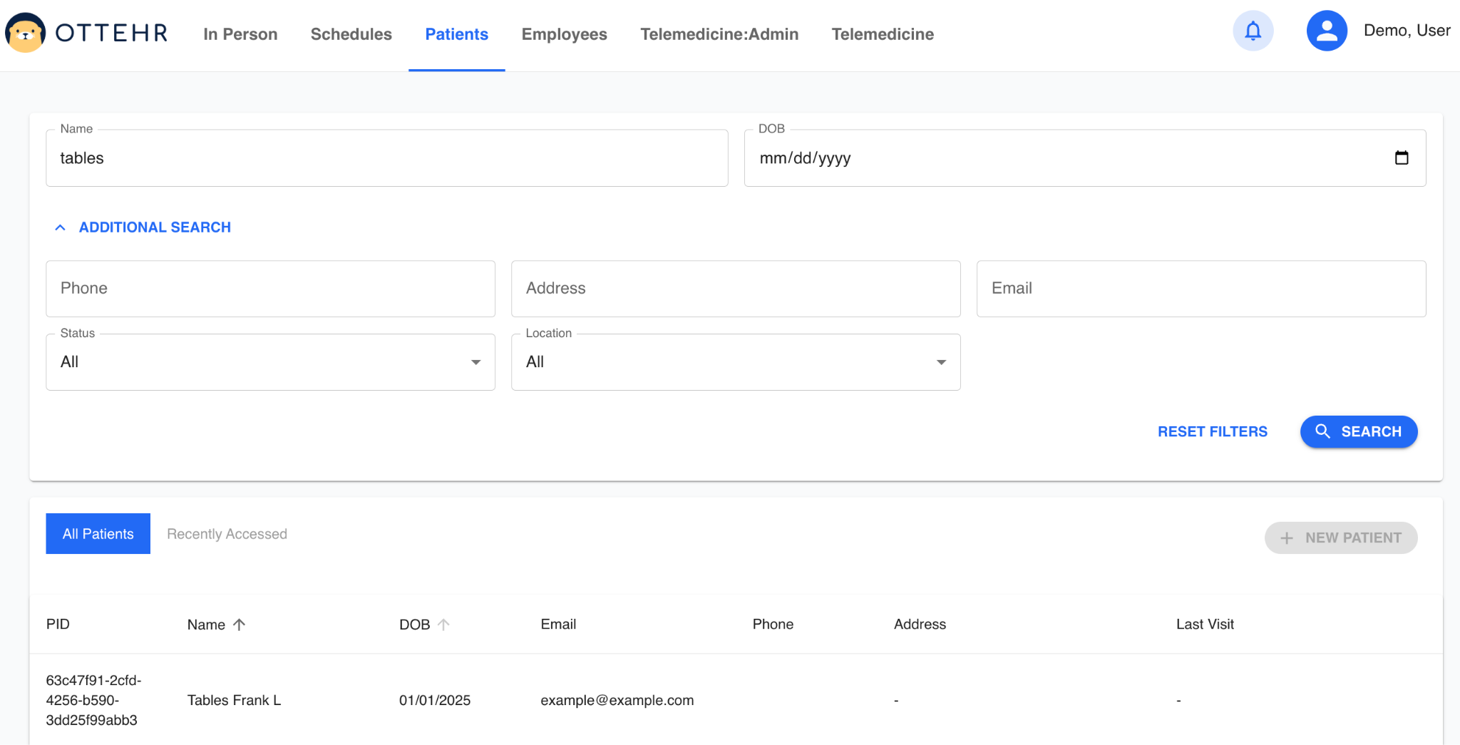 Selecting the 'Patients' tab in the top menu will allow searching for patient records, primarily by name and date of birth. If that isn't enough to clearly identify a patient, other fields like phone number, address, and email address are also available.