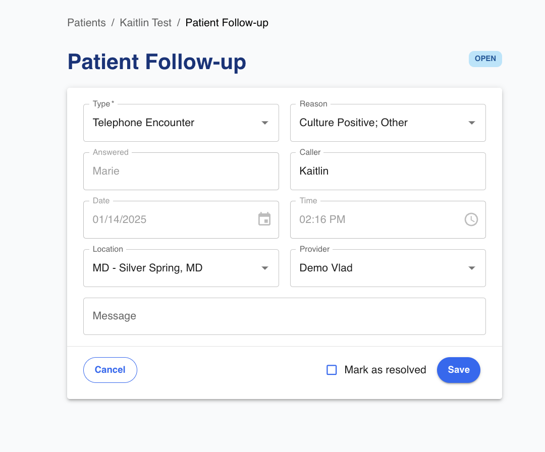 Patient follow-up visits can be left 'open' or close them by selecting the checkbox 'mark as resolved'.