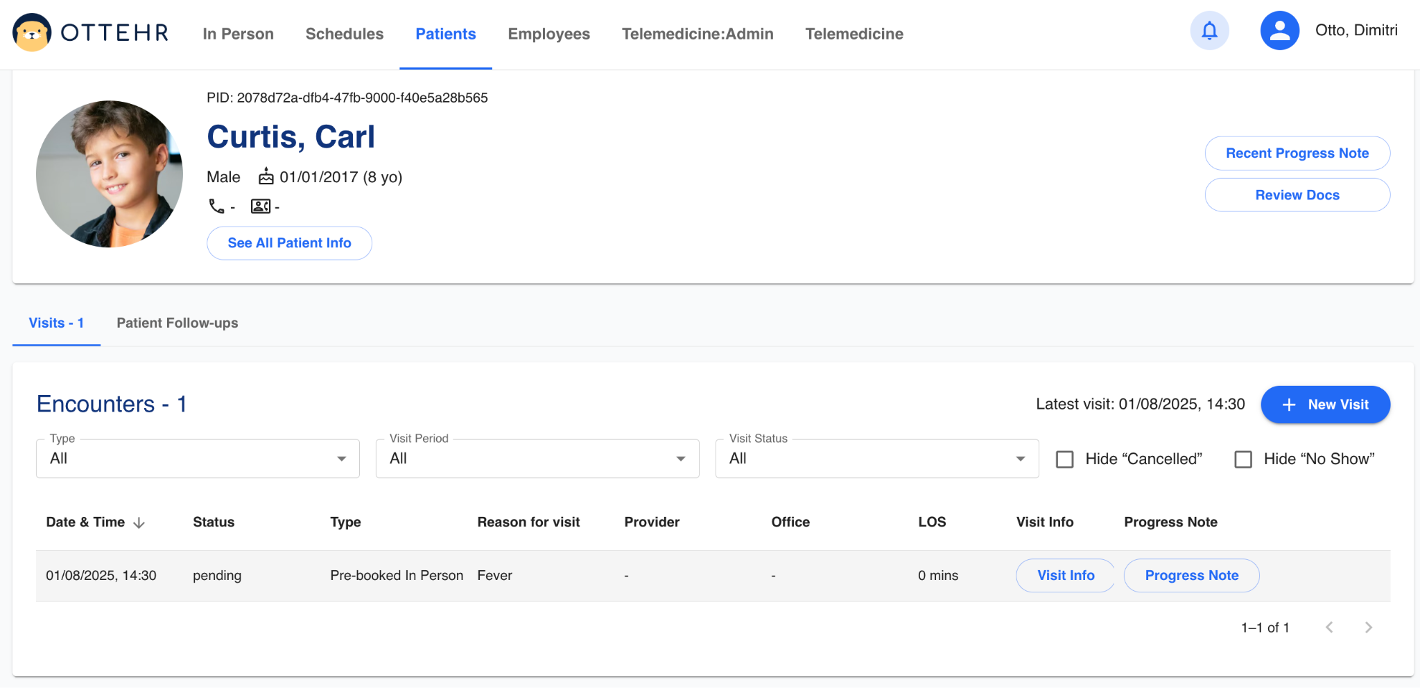 Selecting a patient from the returned search result set will display the Patient Record for that patient including a list of visits/encounters.
