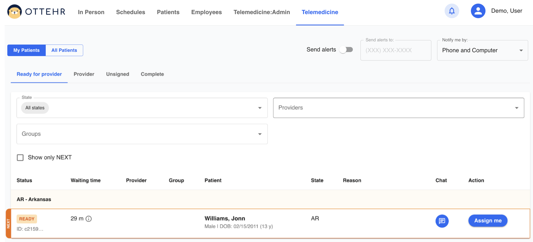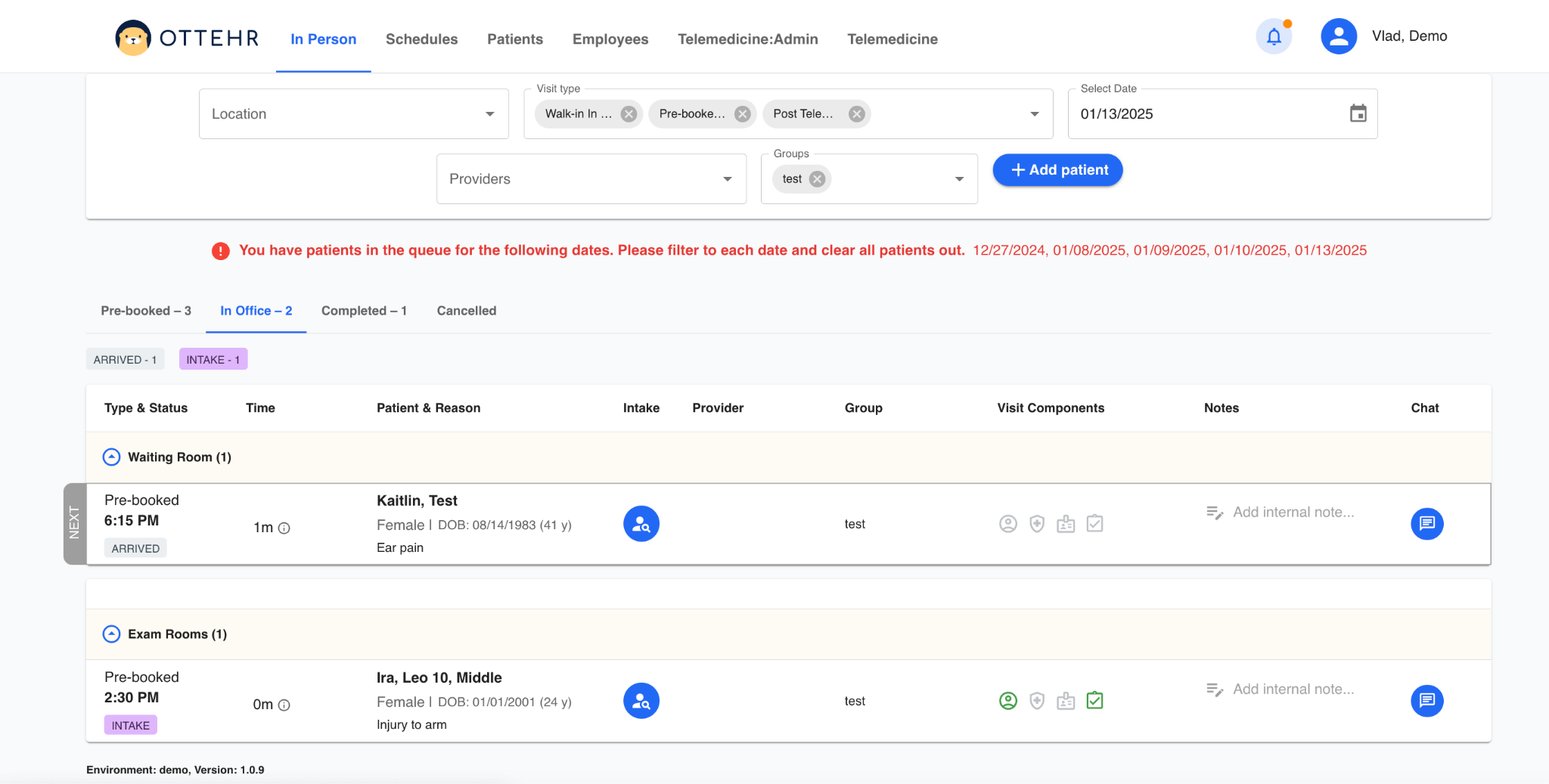 The primary interface for staff who are managing patent queues is the tracking boards. There is one for In-Person queues and one for Virtual/Telemedicine queues. The latter is typically managed by remote providers themselves, allowing them to select and initiate telemedicine sessions with remote patients.