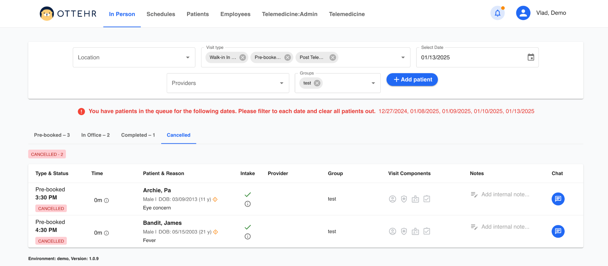 Visits that were cancelled, and no longer need to be tracked by staff, are moved to the Cancelled tab.