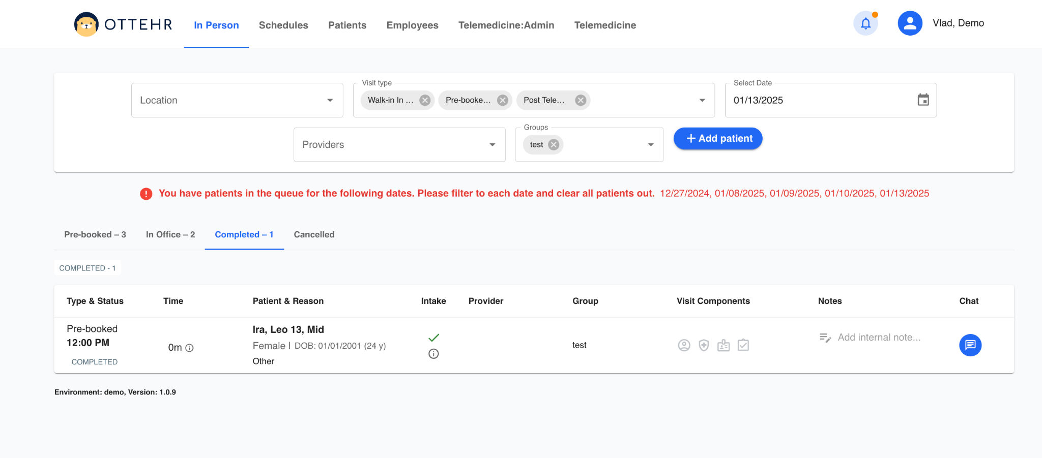 Patients that have finished their consultation with the provider are listed in the Completed tab for the day selected.