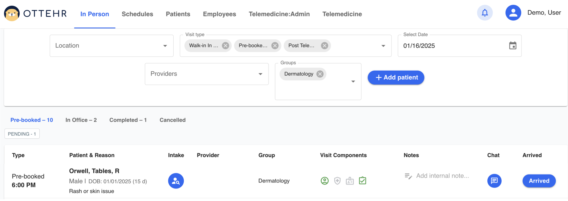 When a patient who has pre-booked arrives in the office, the 'Arrive' button can be pressed to change their status to 'Arrived' and they will move to the 'In-Office' section.