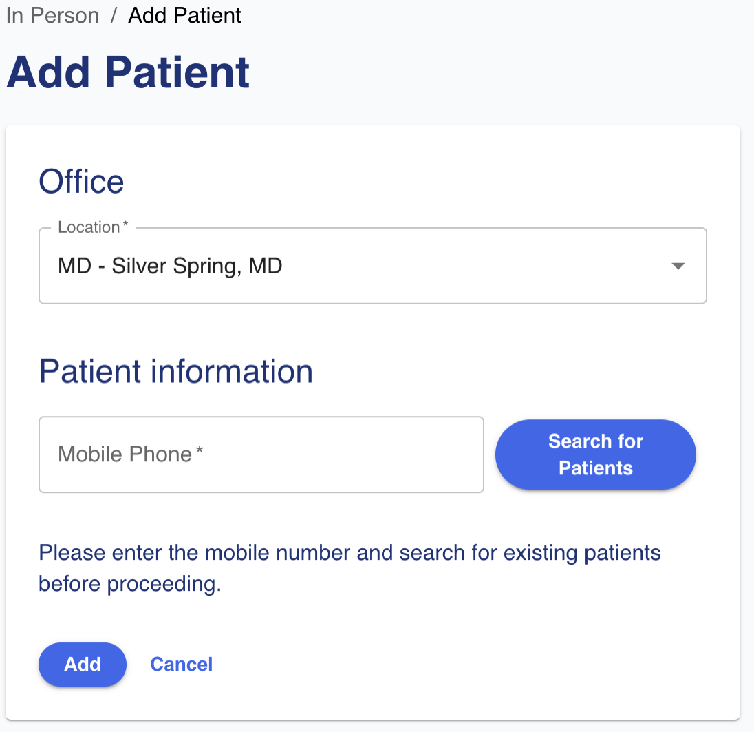 The "Add Patient" button is meant for staff to add a patient who has walked in a location and who has not prebooked using the Patient application.