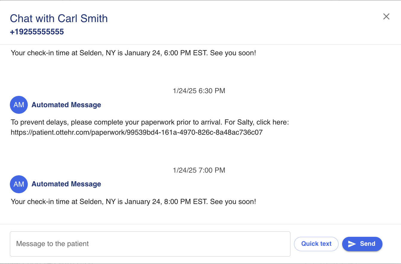 SMS messages between the front desk staff and the patient. Press the Chat icon to open the chat session with the patient. 'Quick Texts' can be configured to automatically fill messages that are frequently sent to patients.